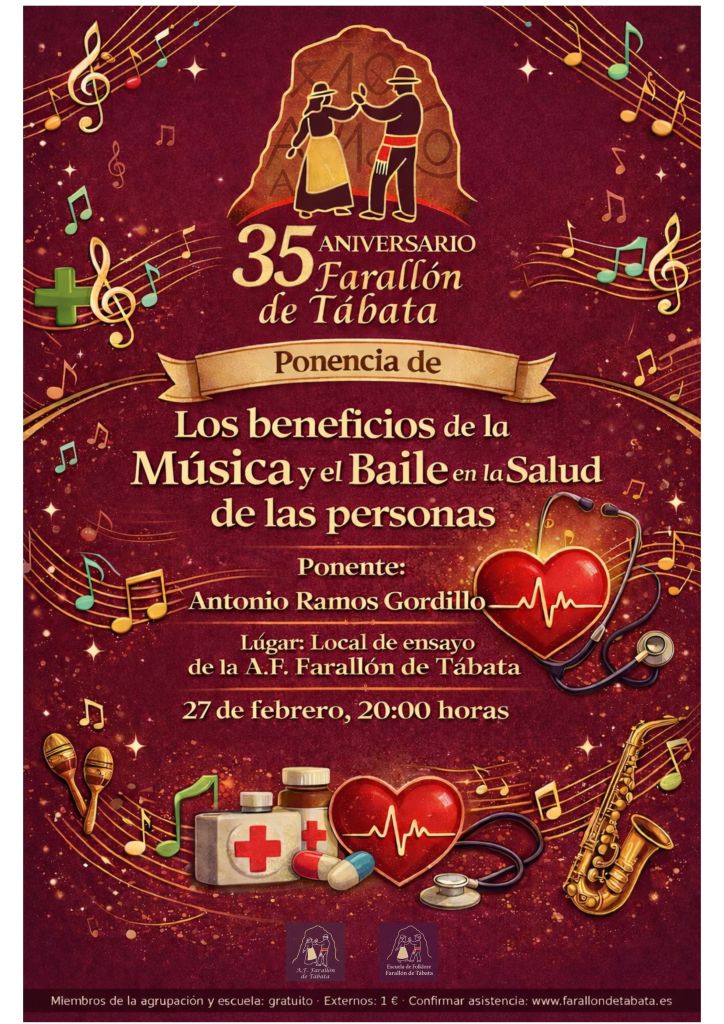 El próximo 27 de febrero a las 20:00, Farallón de Tábata llevará a cabo en su local de ensayo una ponencia sobre los beneficios de la música y el baile en la salud de las personas. Dentro del programa de actos de su treinta y cinco aniversario.